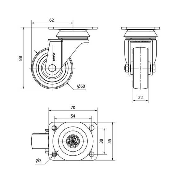 Rueda goma giratoria Alex diametro 60 mm. modelo 2-5140