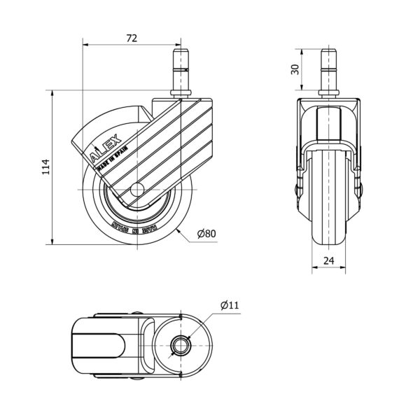 Rueda goma giratoria Alex diametro 80 mm. modelo 2-3206 EAN 8422202232065 n nHOJA TECNICA n nLa serie de ruedas Alex HP-PGI son ruedas de poliamix y goma negra, indicadas para soportar cargas hasta 40 Kg. Se utilizan en expositores, muebles, taburetes, restauración, hospitales, útiles, portagoteros, mobiliario clínico sanitario, goteros y carros de limpieza. PGI: No rallan ni manchan el suelo. Aptas para todo tipo de superficies.
