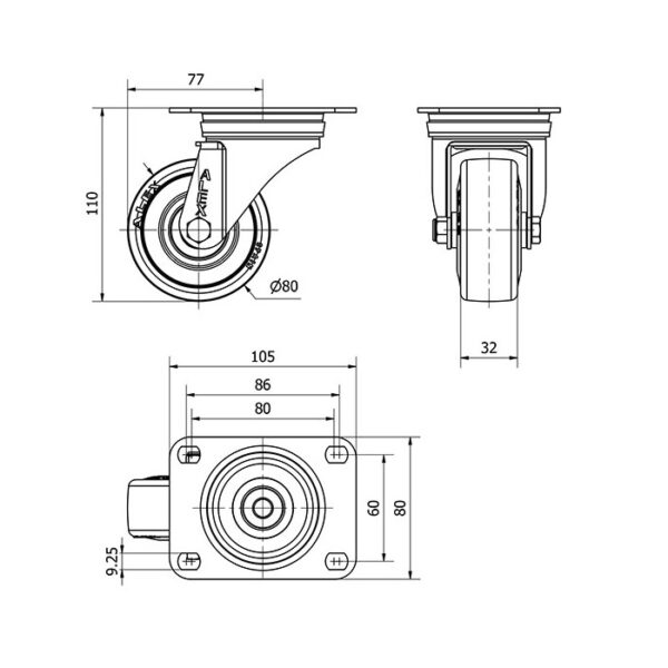 Rueda goma giratoria Alex diametro 80 mm. modelo 2-2385