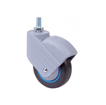 La serie de ruedas Alex HP-PGI son ruedas de poliamix y goma negra, indicadas para soportar cargas hasta 40 Kg. Se utilizan en expositores, muebles, taburetes, restauración, hospitales, útiles, portagoteros, mobiliario clínico sanitario, goteros y carros de limpieza. PGI: No rallan ni manchan el suelo. Aptas para todo tipo de superficies.