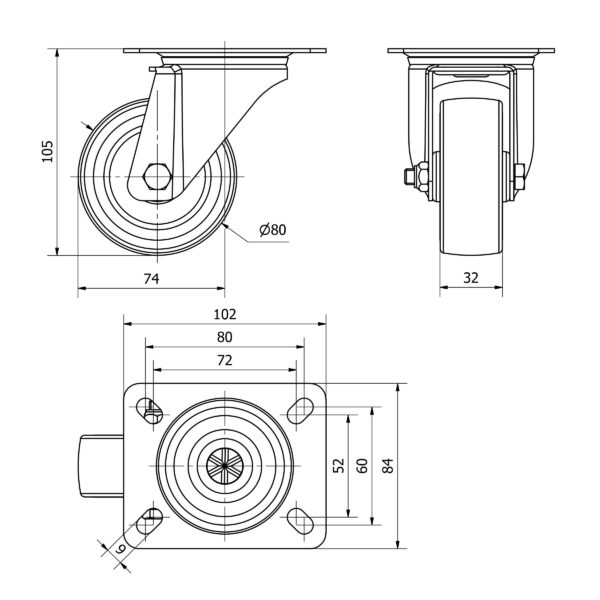 Rueda goma giratoria Alex diametro 80 mm. modelo TW0220 EAN 8422202002200