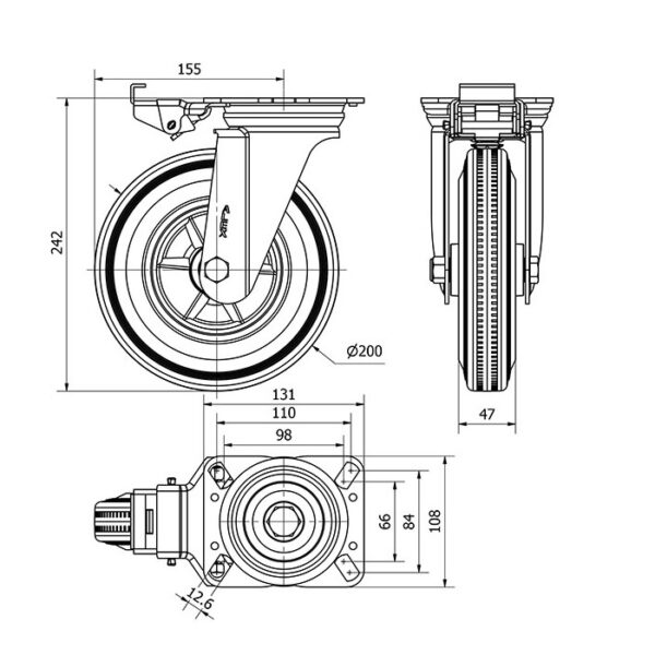 Rueda goma giratoria con bloqueo direccional Alex diametro 200 mm. 2-3332
