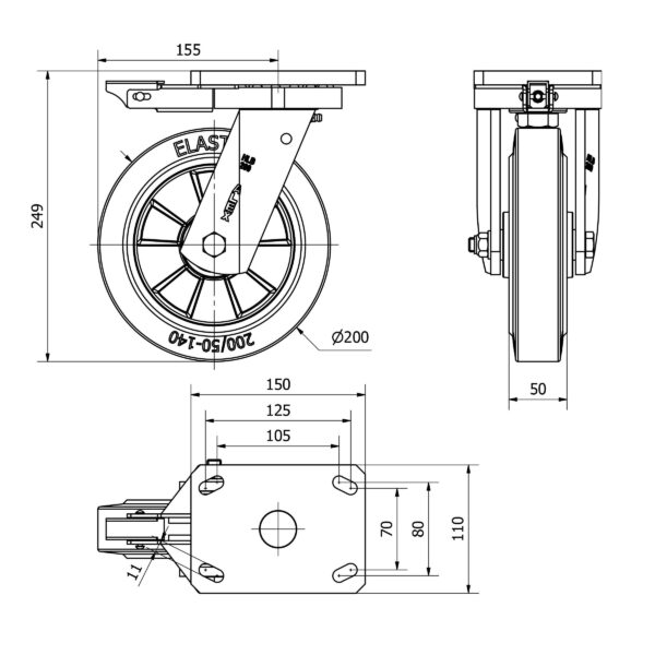 Rueda goma giratoria con bloqueo direccional Alex diametro 200 mm. modelo 2-3351
