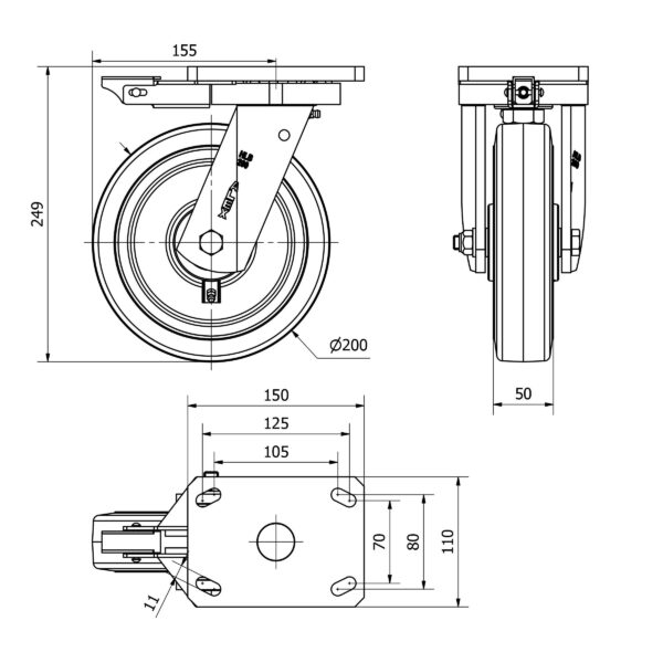 Rueda goma giratoria con bloqueo direccional Alex diametro 200 mm. modelo 2-3357
