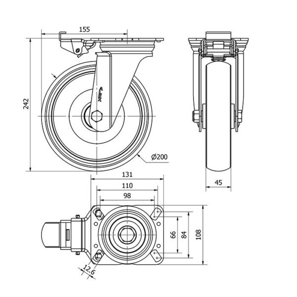 Rueda goma giratoria con bloqueo direccional Alex diametro 200 mm. modelo 2-3436