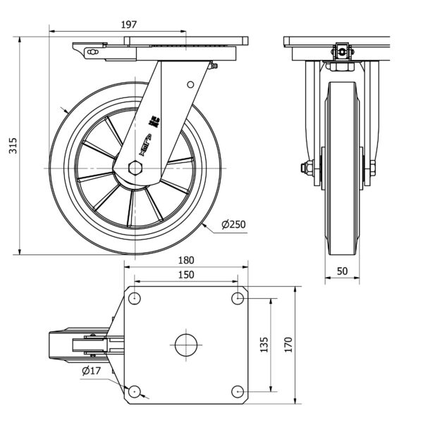 Rueda goma giratoria con bloqueo direccional Alex diametro 250 mm. modelo 2-3353