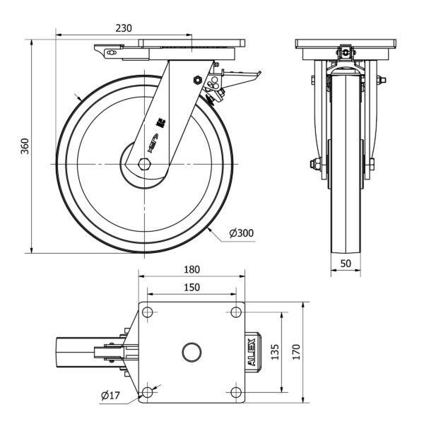 Rueda goma giratoria con bloqueo direccional Alex diametro 300 mm. modelo 2-3360 EAN 8422202233604