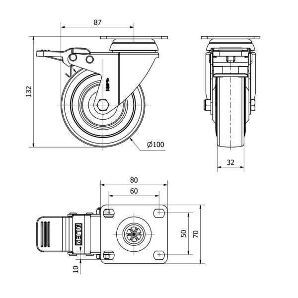 Rueda goma giratoria con freno Alex diametro 100 mm. 2-4586