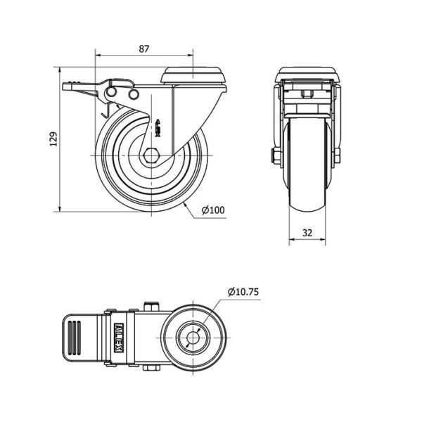 Rueda goma giratoria con freno Alex diametro 100 mm. 2-4604