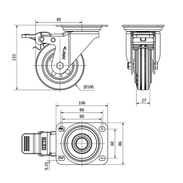 Rueda goma giratoria con freno Alex diametro 100 mm. modelo 2-1149