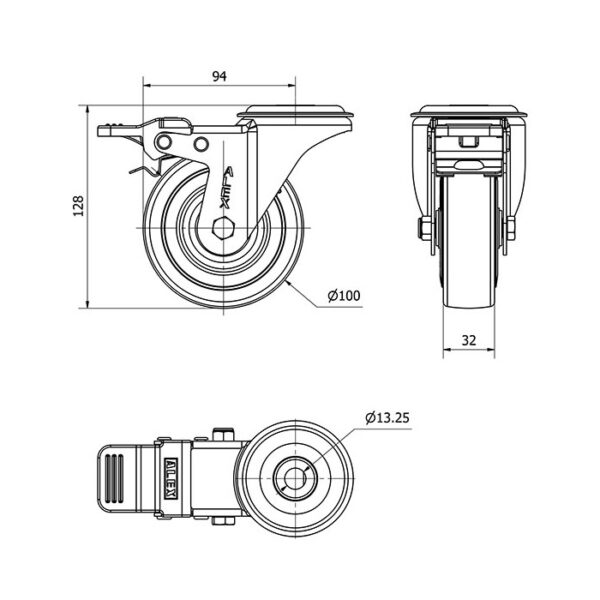 Rueda goma giratoria con freno Alex diametro 100 mm. modelo 2-1666