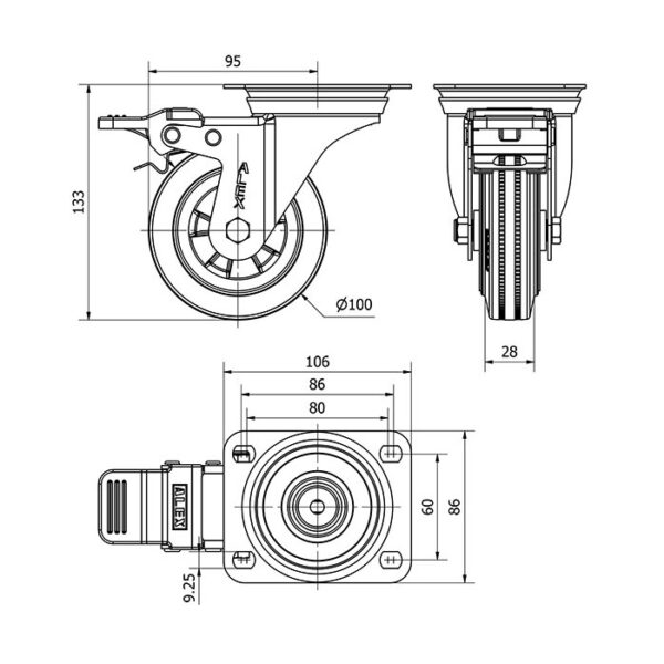 Rueda goma giratoria con freno Alex diametro 100 mm. modelo 2-1679