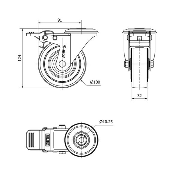 Rueda goma giratoria con freno Alex diametro 100 mm. modelo 2-1836