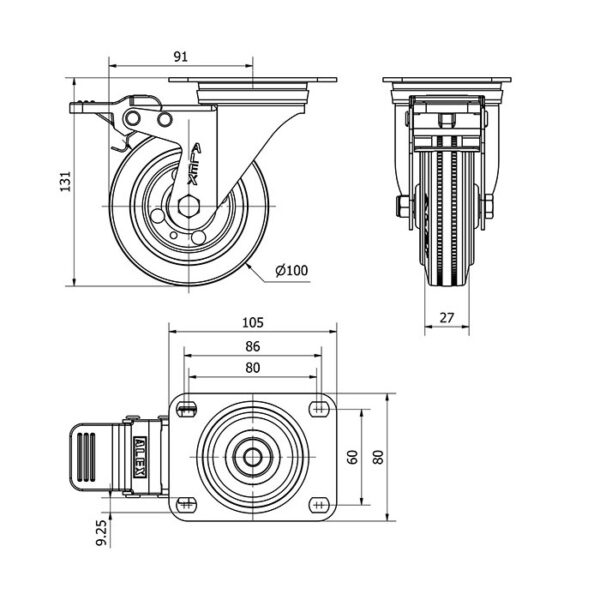 Rueda goma giratoria con freno Alex diametro 100 mm. modelo 2-1908