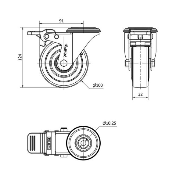 Rueda goma giratoria con freno Alex diametro 100 mm. modelo 2-2493