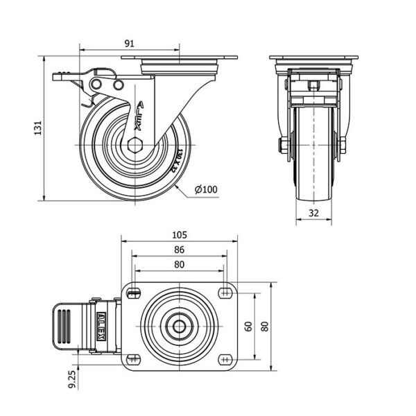 Rueda goma giratoria con freno Alex diametro 100 mm. modelo 2-2502
