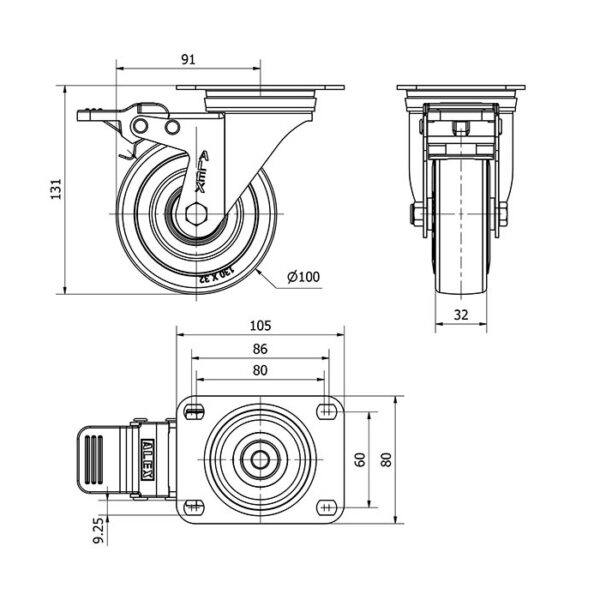 Rueda goma giratoria con freno Alex diametro 100 mm. modelo 2-2503