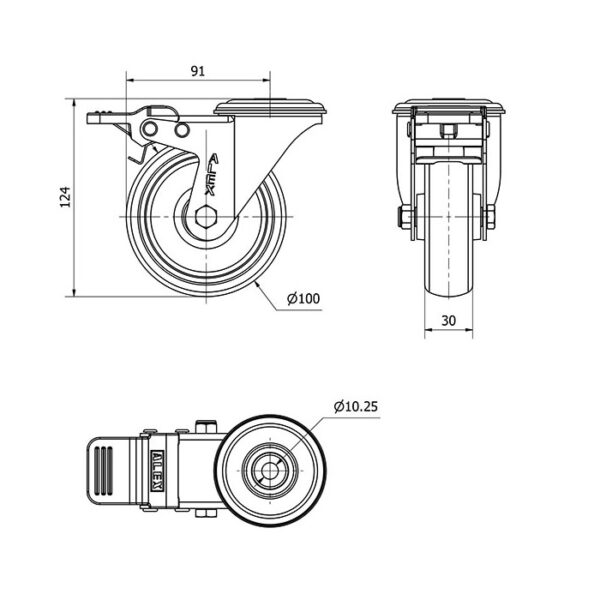 Rueda goma giratoria con freno Alex diametro 100 mm. modelo 2-3302