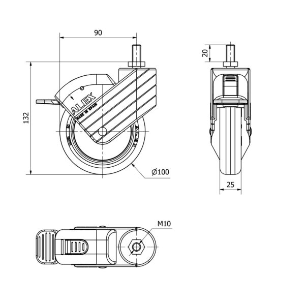 Rueda goma giratoria con freno Alex diametro 100 mm. modelo 2-3318