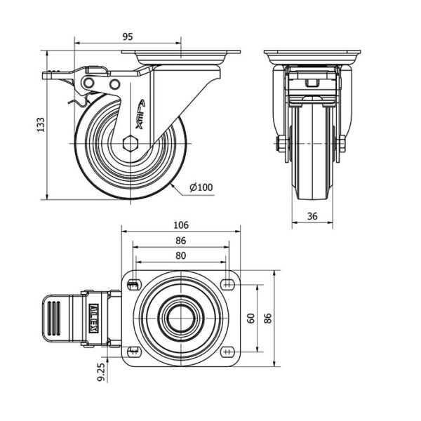 Rueda goma giratoria con freno Alex diametro 100 mm. modelo 2-3761