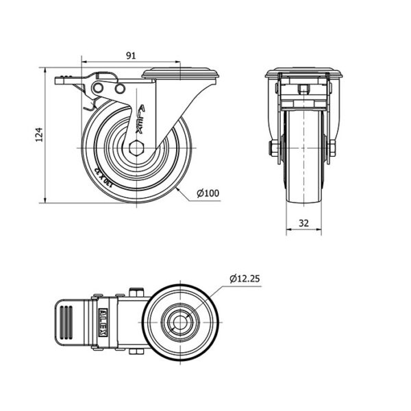 Rueda goma giratoria con freno Alex diametro 100 mm. modelo 2-4096