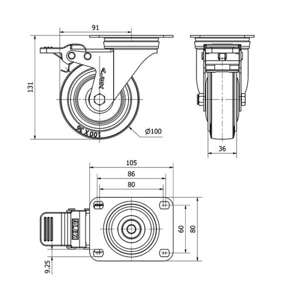 Rueda goma giratoria con freno Alex diametro 100 mm. modelo 2-4447