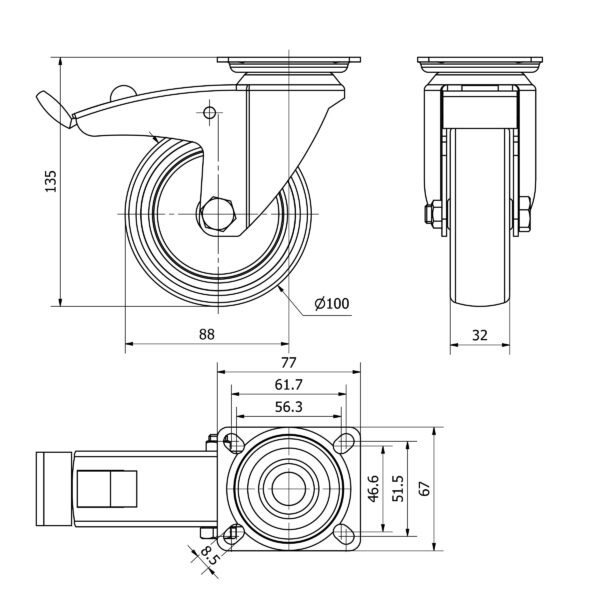 Rueda goma giratoria con freno Alex diametro 100 mm. modelo TW0071
