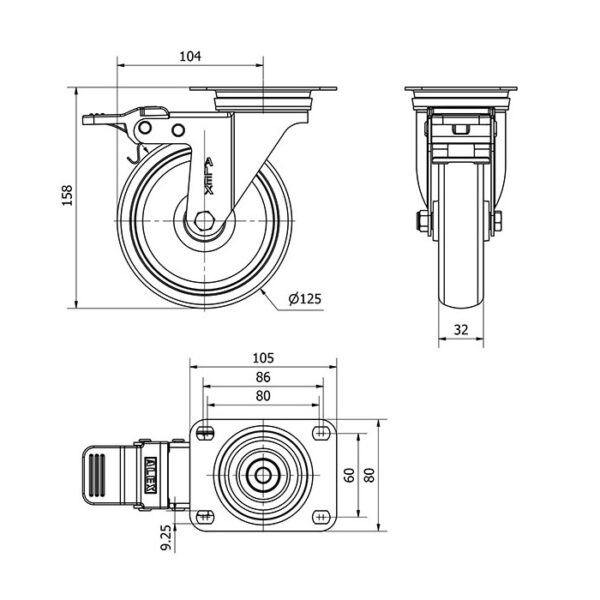 Rueda goma giratoria con freno Alex diametro 125 mm. 2-4935