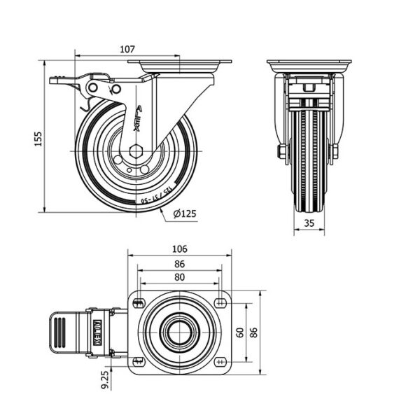 Rueda goma giratoria con freno Alex diametro 125 mm. modelo 2-1150