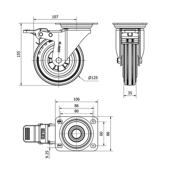 Rueda goma giratoria con freno Alex diametro 125 mm. modelo 2-1153