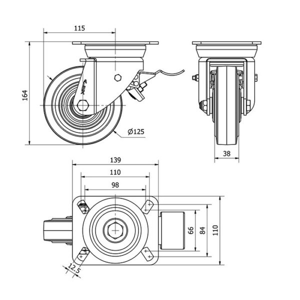 Rueda goma giratoria con freno Alex diametro 125 mm. modelo 2-2048