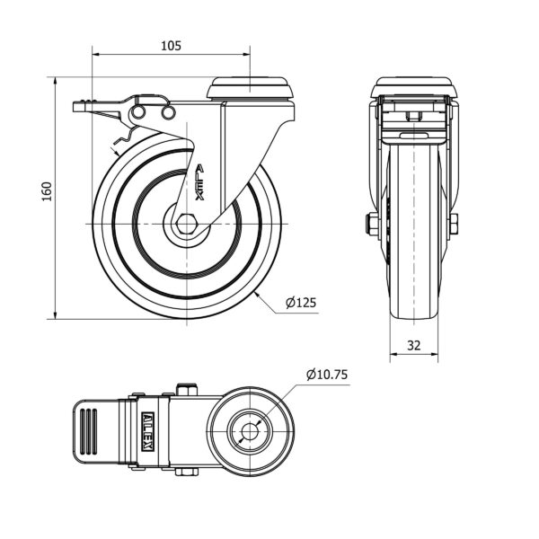 Rueda goma giratoria con freno Alex diametro 125 mm. modelo 2-2190