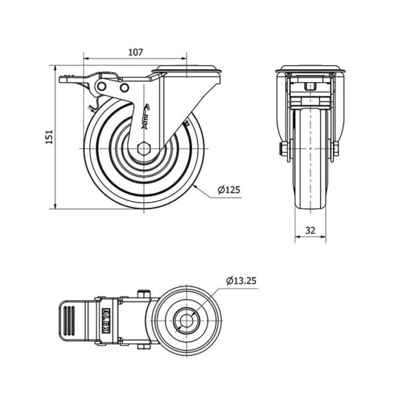 Rueda goma giratoria con freno Alex diametro 125 mm. modelo 2-2413