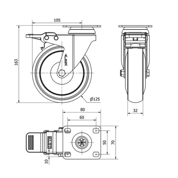 Rueda goma giratoria con freno Alex diametro 125 mm. modelo 2-2720