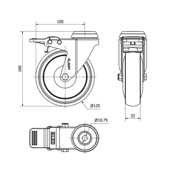 Rueda goma giratoria con freno Alex diametro 125 mm. modelo 2-2722