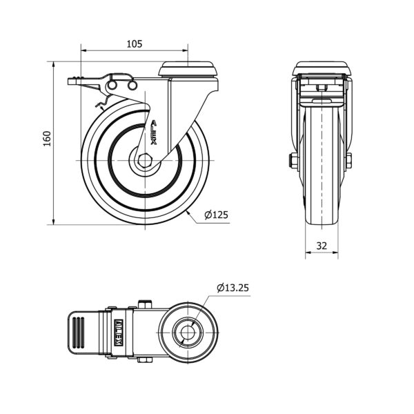 Rueda goma giratoria con freno Alex diametro 125 mm. modelo 2-4600