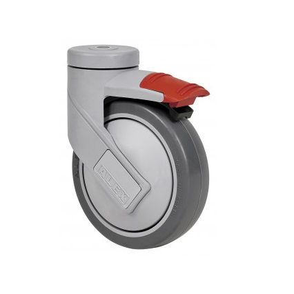 La serie de ruedas Alex HC-PGAIB son ruedas de goma termoplástica gris inyectada, con soporte fabricado en poliamida de alta calidad endurecida con fibra de vidrio, cabezal giratorio superior construido en doble hilera de bolas endurecidas (fijación placa y agujero pasante) y cojinete de bolas de precisión insertado (fijación espiga roscada), indicadas para soportar cargas hasta 100 Kg. Se utilizan en mobiliario clínico-sanitario, salas de operaciones, quirófanos, camas, usos hospitalarios, restauración y cocinas. PGAIB: Silenciosa, absorbe las vibraciones, no deja huella en los pavimentos y de fácil desplazamiento.