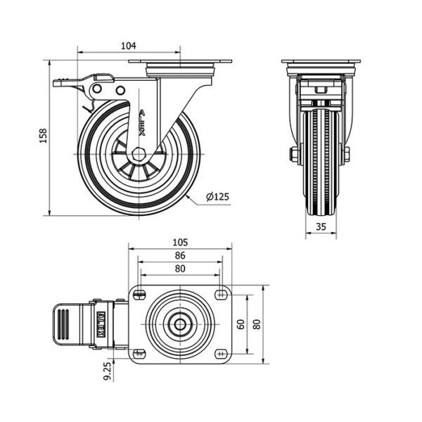 Rueda goma giratoria con freno Alex diametro 125 mm. modelo 2-4845