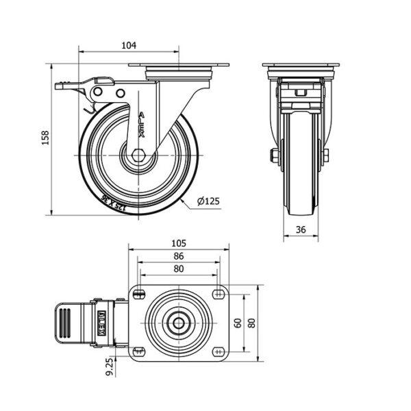 Rueda goma giratoria con freno Alex diametro 125 mm. modelo 2-4860