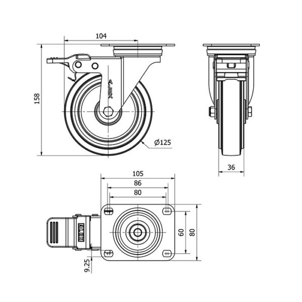Rueda goma giratoria con freno Alex diametro 125 mm. modelo 2-4865
