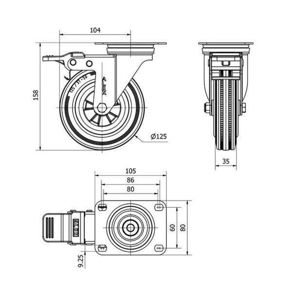 Rueda goma giratoria con freno Alex diametro 125 mm. modelo 2-4925