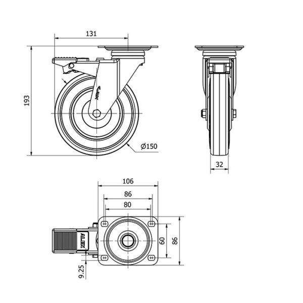 Rueda goma giratoria con freno Alex diametro 150 mm. modelo 2-1229