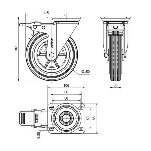 Rueda goma giratoria con freno Alex diametro 150 mm. modelo 2-2887