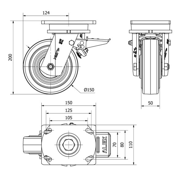 Rueda goma giratoria con freno Alex diametro 150 mm. modelo 2-3645