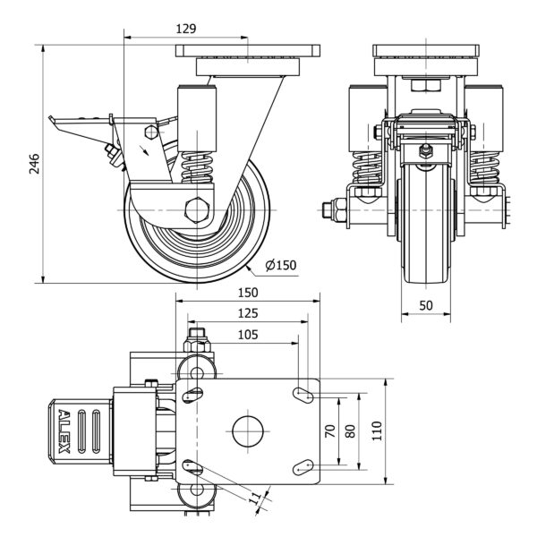 Rueda goma giratoria con freno Alex diametro 150 mm. modelo 2-4050