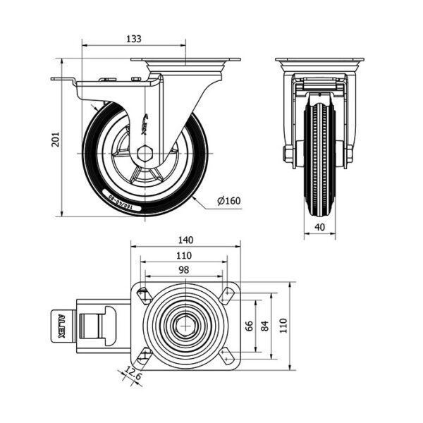 Rueda goma giratoria con freno Alex diametro 160 mm. modelo 2-1684