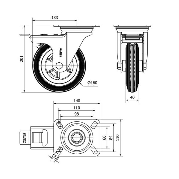 Rueda goma giratoria con freno Alex diametro 160 mm. modelo 2-3406