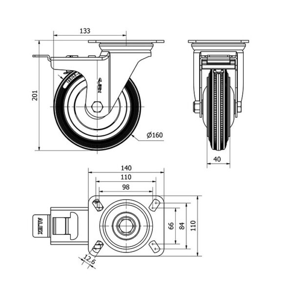 Rueda goma giratoria con freno Alex diametro 160 mm. modelo 2-3554