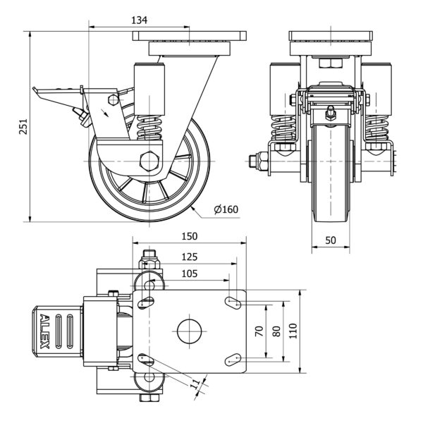 Rueda goma giratoria con freno Alex diametro 160 mm. modelo 2-4047