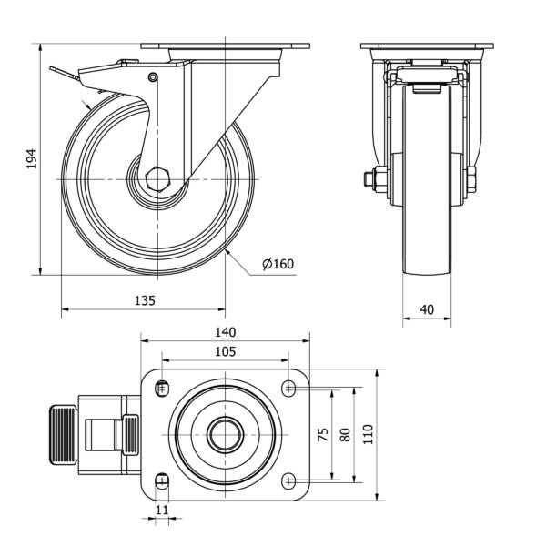 Rueda goma giratoria con freno Alex diametro 160 mm. modelo TW0304